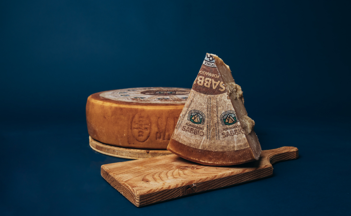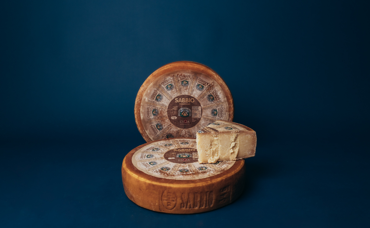Tipico formaggio stagionato, fino anche a 24 mesi, viene prodotto da latte parzialmente scremato e a pasta semicotta. La lunga stagionatura, il processo di produzione e il latte utilizzato, donano al "Sabbio" una consistenza compatta, con poca e piccola occhiatura regolare, sapore forte ma non piccante, profumo intenso e colore decisamente paglierino. Nelle forme con una stagionatura superiore ai 15 mesi troviamo anche la presenza dei tipici grani. Durante la stagionatura, come tradizione secolare nelle nostre valli, la crosta viene oleata con olio di lino crudo alimentare per evitare una eccessiva essicazione e dare una protezione alla stessa. Ogni forma ha un diametro di circa 33 cm ed un peso tra i 7.2 e 7,5 kg. Ottimo da gustare a fine pasto con un buon bicchiere di vino.